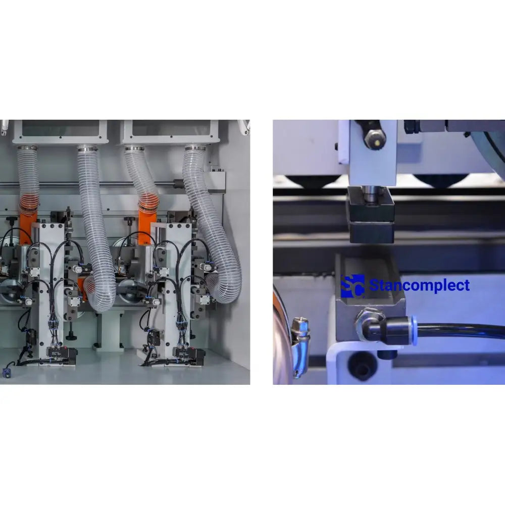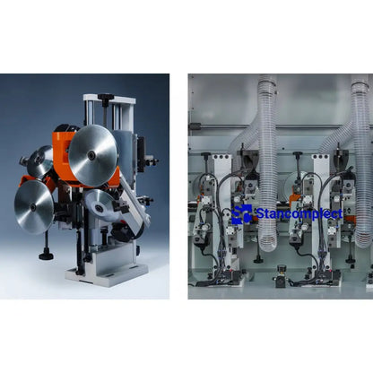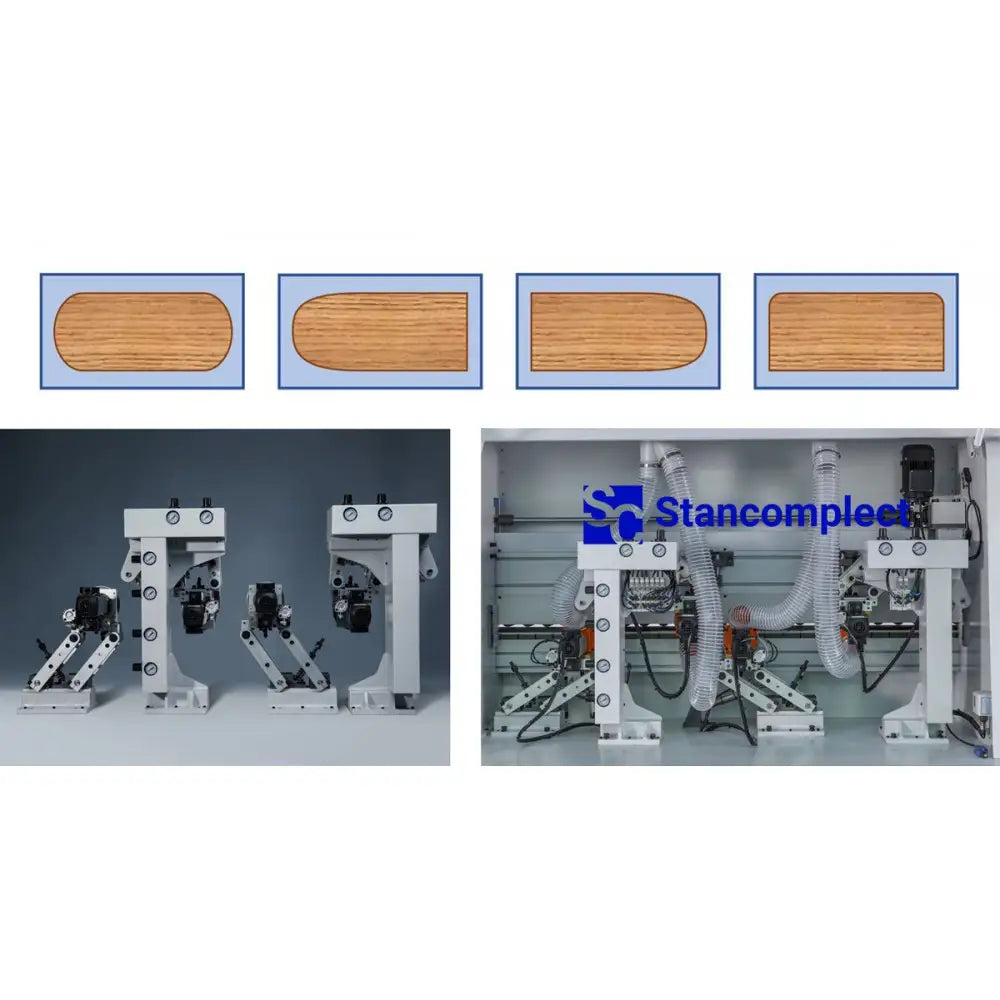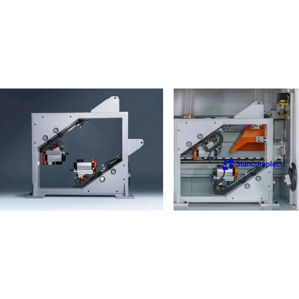 Frezavimo įrenginys su spindulinėmis frezomis, kuriomis galima apdoroti 0,4-3,0 mm storio briaunas. Ruošinį seka du dideli apvalūs kopijavimo ritiniai (ant kiekvieno variklio), sumontuoti ant plūduriuojančio įrenginio, tokia konstrukcija apsaugo nuo broko frezuojant.
