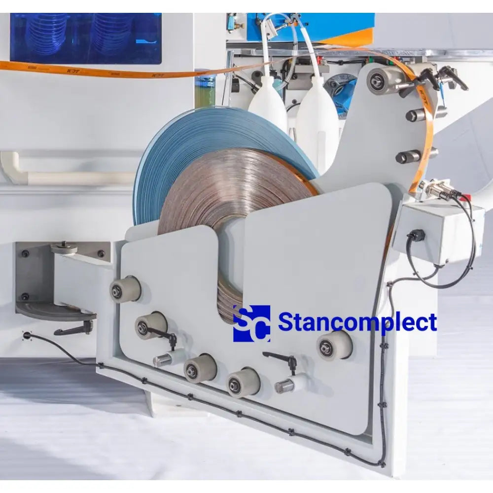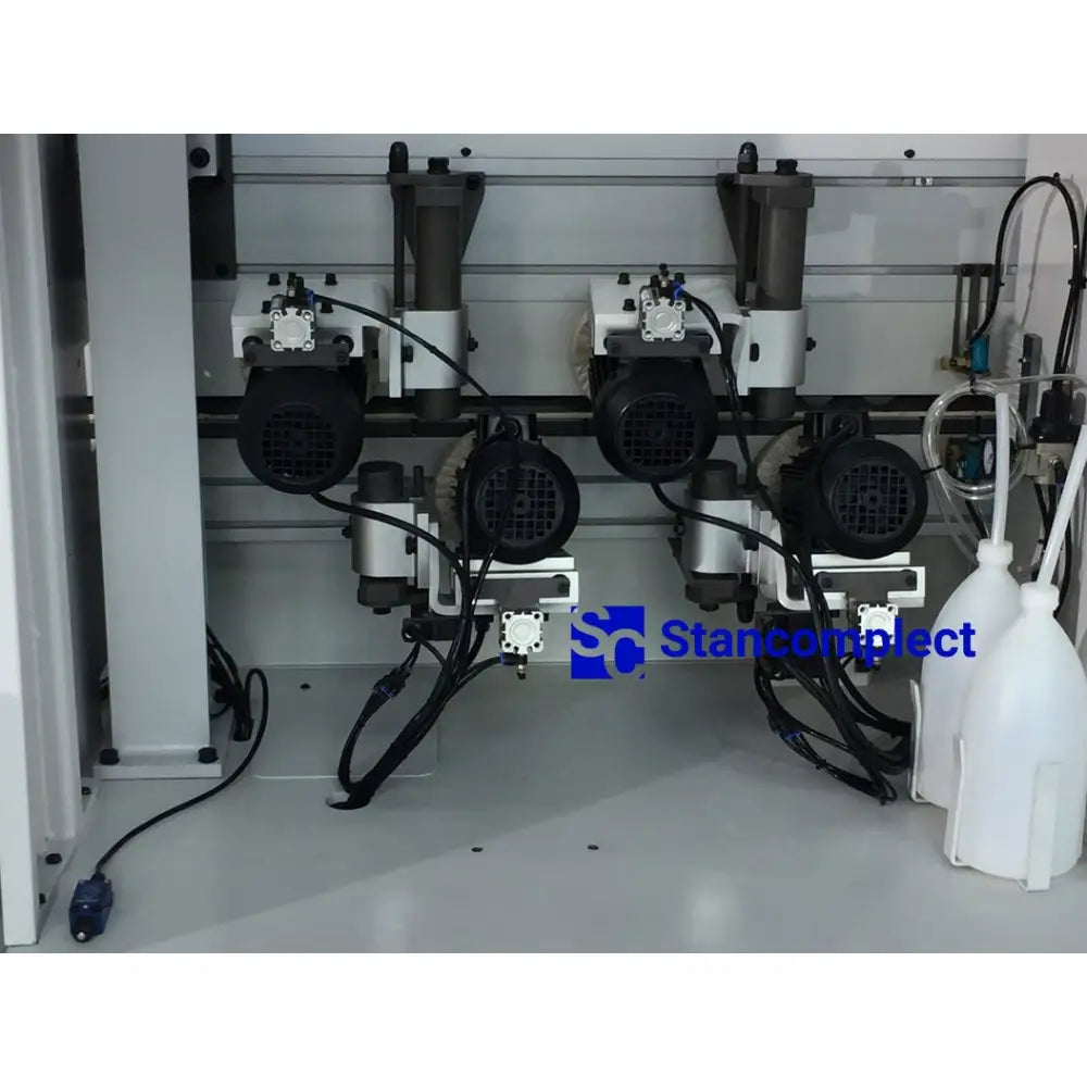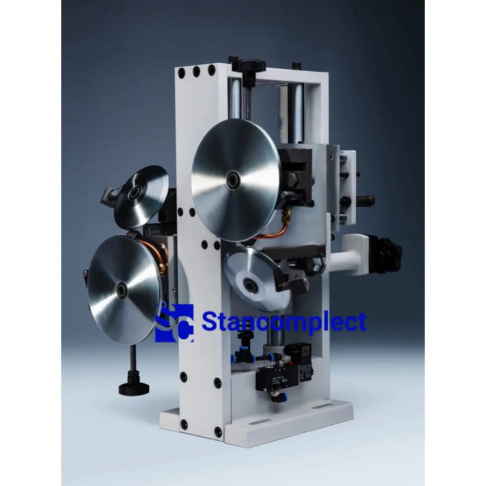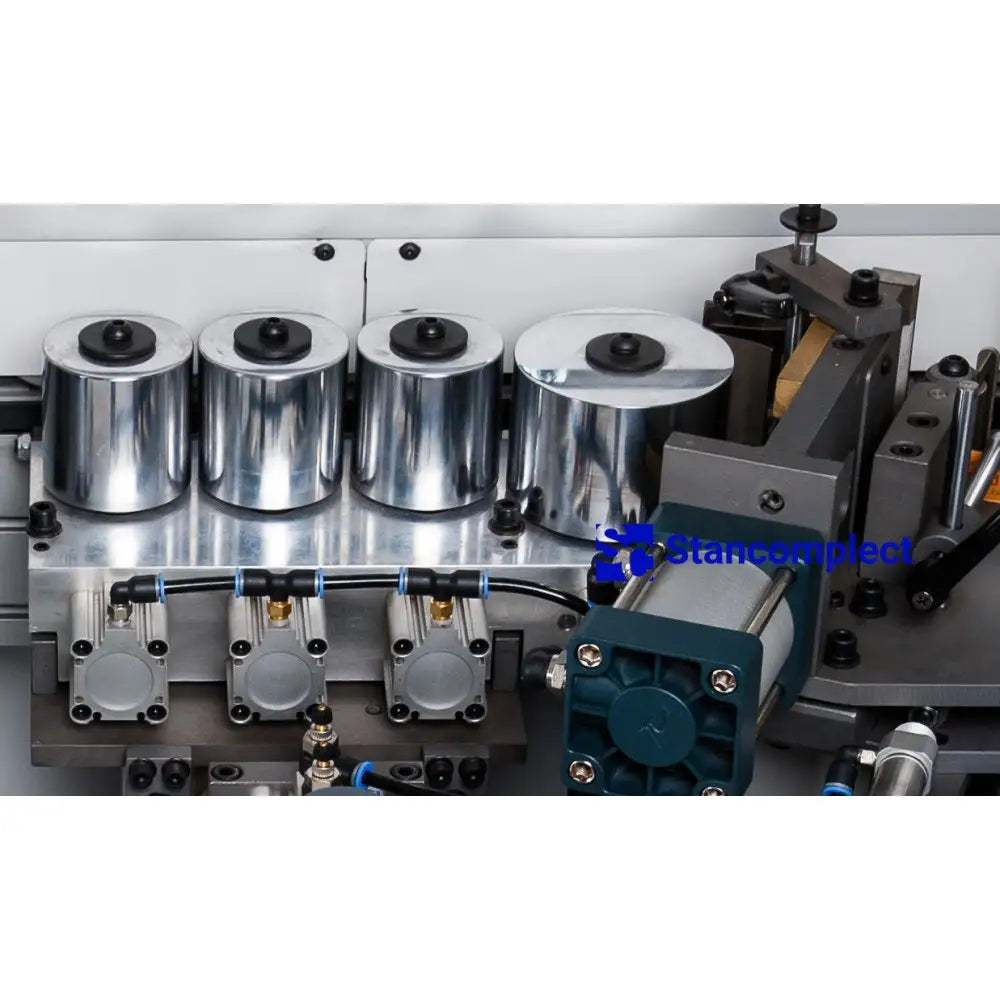 Susideda iš 5 ritinių, kurie yra įjungiami pneumatinio prispaudimo pagalba. Iš 4-ių ritinių 2 turi kūginę formą, kas leidžia pašalinti oro tarpus detalės viršuje ir apačioje, kas būtina naudojant PUR klijus, kuriuos taipogi galite naudoti mūsų staklėse. Kiekvienas ritinys turi valymo skustuką, kuris nuvalo visus klijų likučius o taipogi dulkes ir kitą purvą.